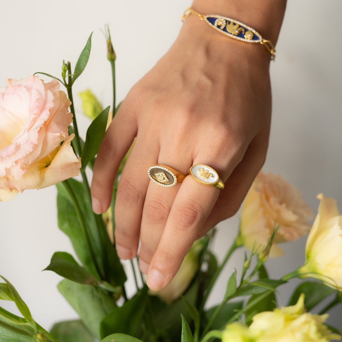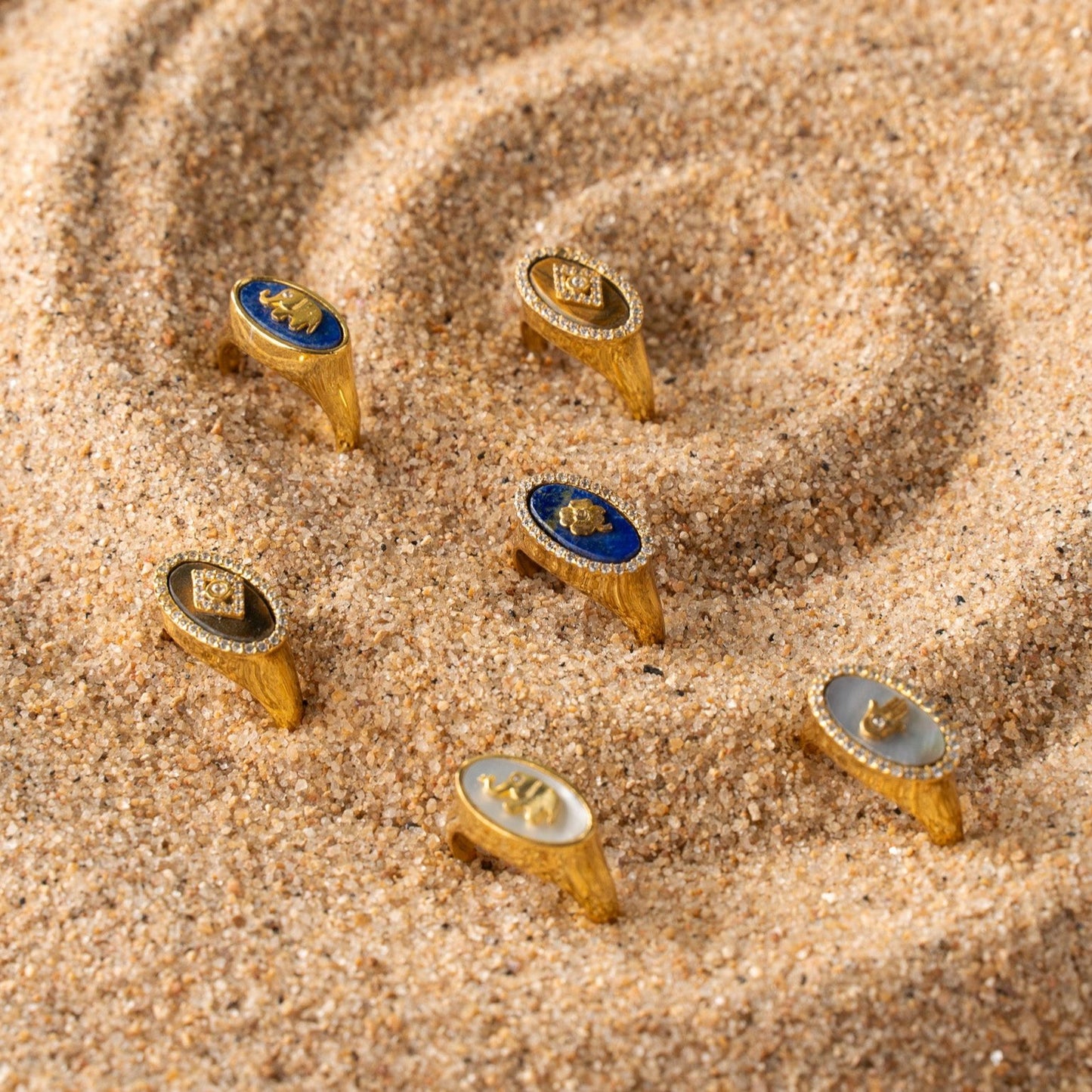 A captivating signet ring featuring an intricately inlaid evil eye on a mesmerizing tiger’s eye surface. The evil eye, a powerful symbol of protection and warding off negativity, is crafted in gleaming gold or silver, standing out against the warm, chatoyant golden-brown hues of the tiger’s eye. The natural shifting bands of the stone add depth and movement, enhancing the mystical allure of the design. Set on a bold yet refined band, this ring embodies both strength and spiritual safeguarding, making it a striking and meaningful accessory.