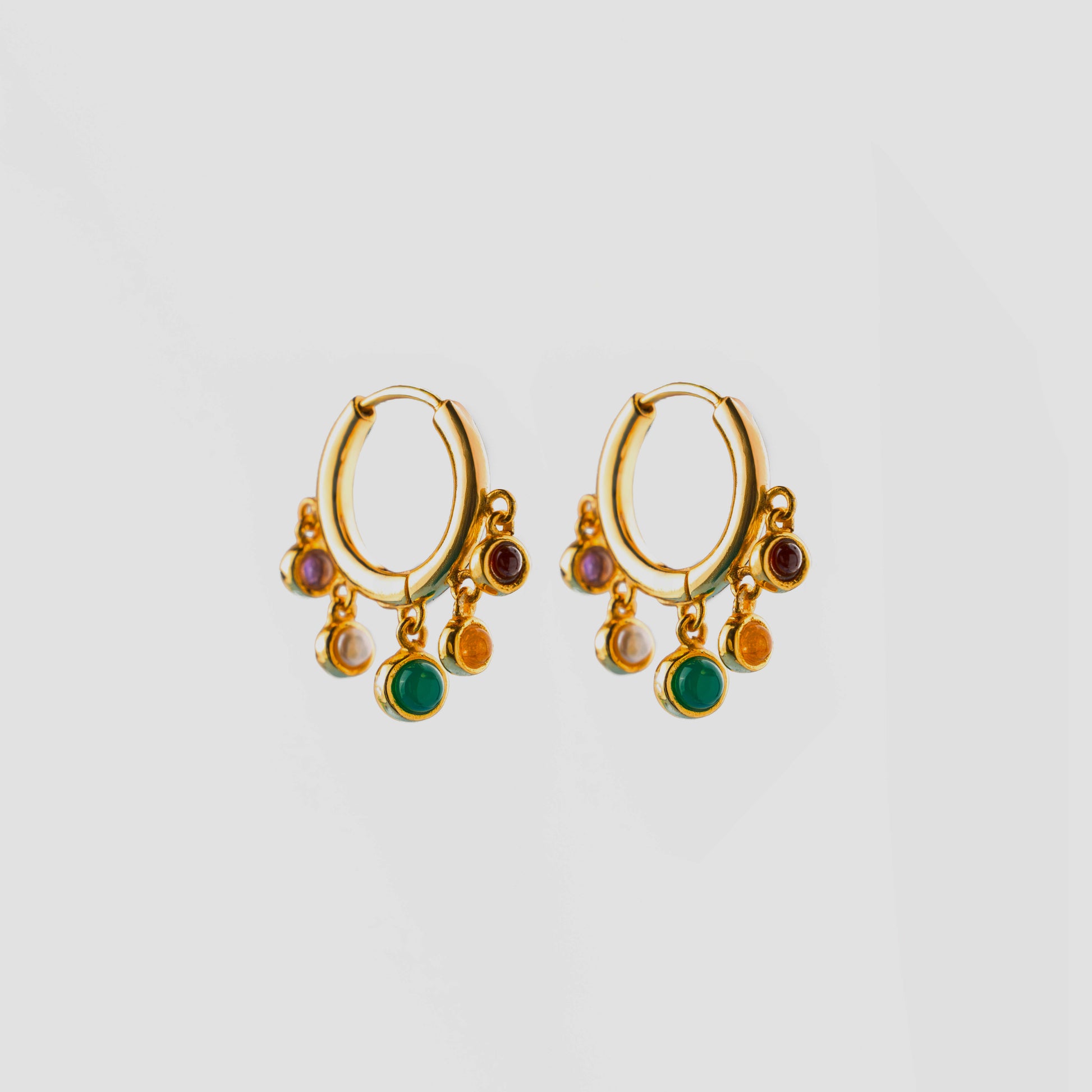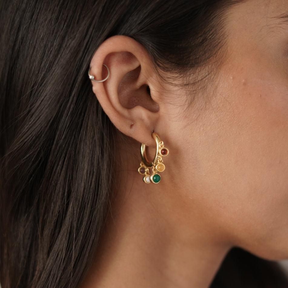 The stones hang symmetrically around the hoop, offering a balanced yet dynamic look, perfect for someone who appreciates a blend of classic elegance and modern design.