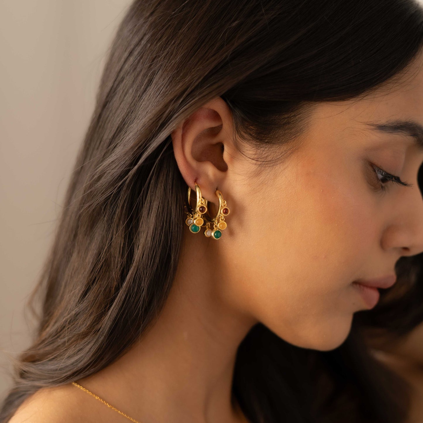 A sleek and contemporary hoop earring design featuring navrattan stones set in a unique donut-shaped setting. The hoops are minimalist and polished, made from fine metal, allowing the dangling stones to take center stage. Each stone is embedded in a circular donut-like frame, creating a modern twist on traditional jewelry.