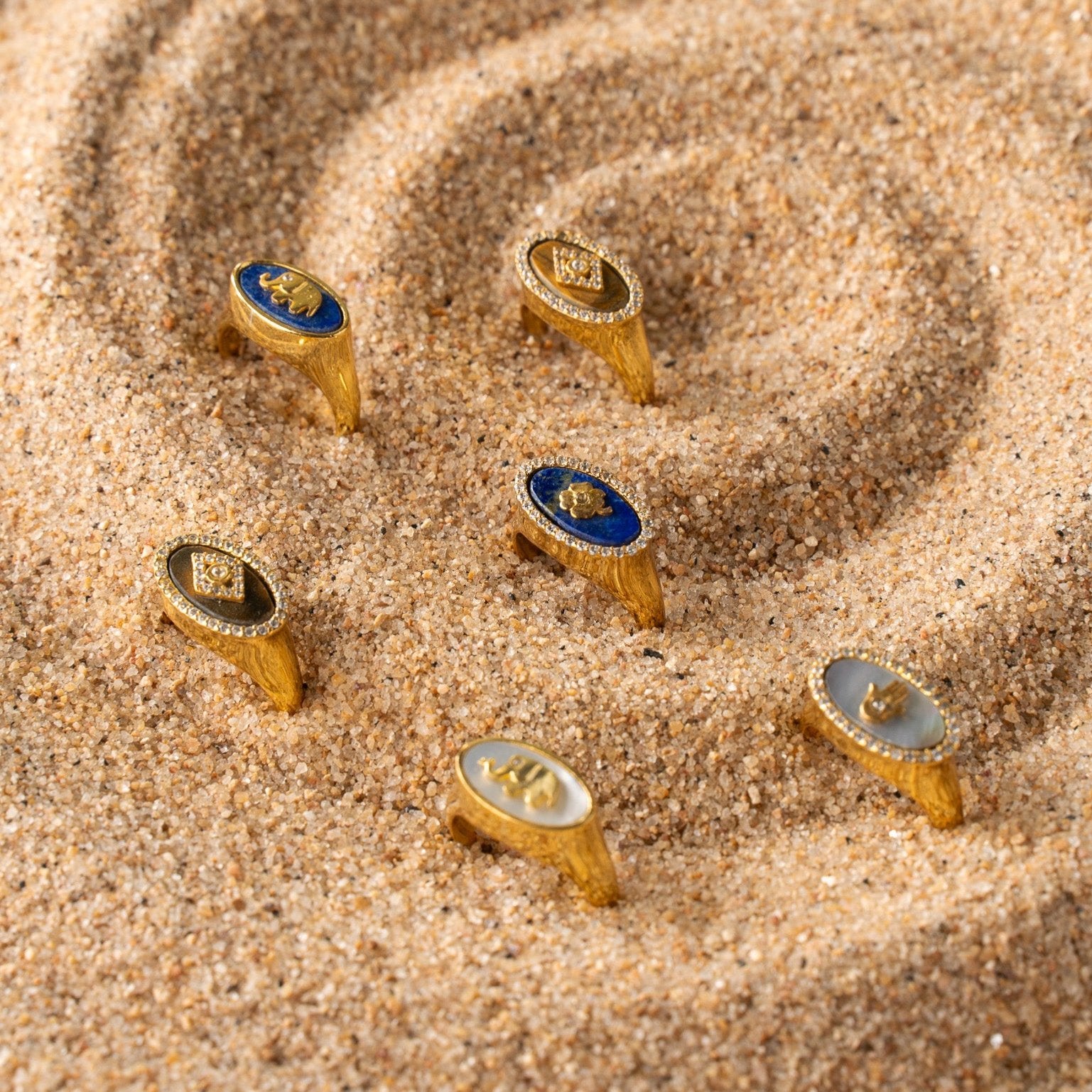 The clover, a universal symbol of luck and prosperity, is crafted in gleaming gold or silver, its polished edges contrasting beautifully with the rich, speckled gold inclusions of the lapis lazuli. The bold, smooth band enhances the piece's timeless appeal, while the natural stone's celestial tones give it a unique and regal character. This ring embodies a perfect harmony of elegance and meaning, ideal for those who appreciate symbolism in their accessories.