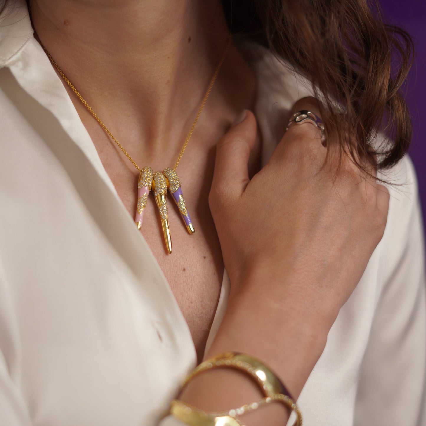 Shiny stones share their throne with a rainbow of eye-catching hues that bring joy to necks. Stack them, Layer them or reverse them these pendants have all the playfulness one needs in their wardrobe.