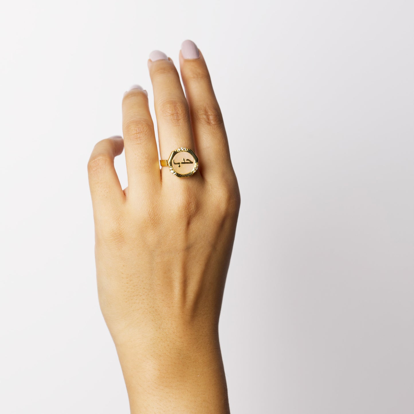 Handcrafted in 18k gold plated brass this Love (Hub) Arabic Scripture Ring is a chance to express who you are and to hold on to precious thoughts. This Ring is all about giving one a positive or optimistic attitude about all the events in one's day to day life.