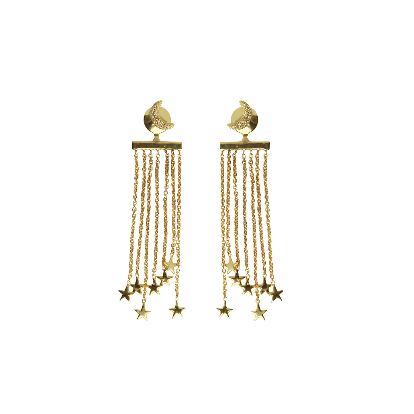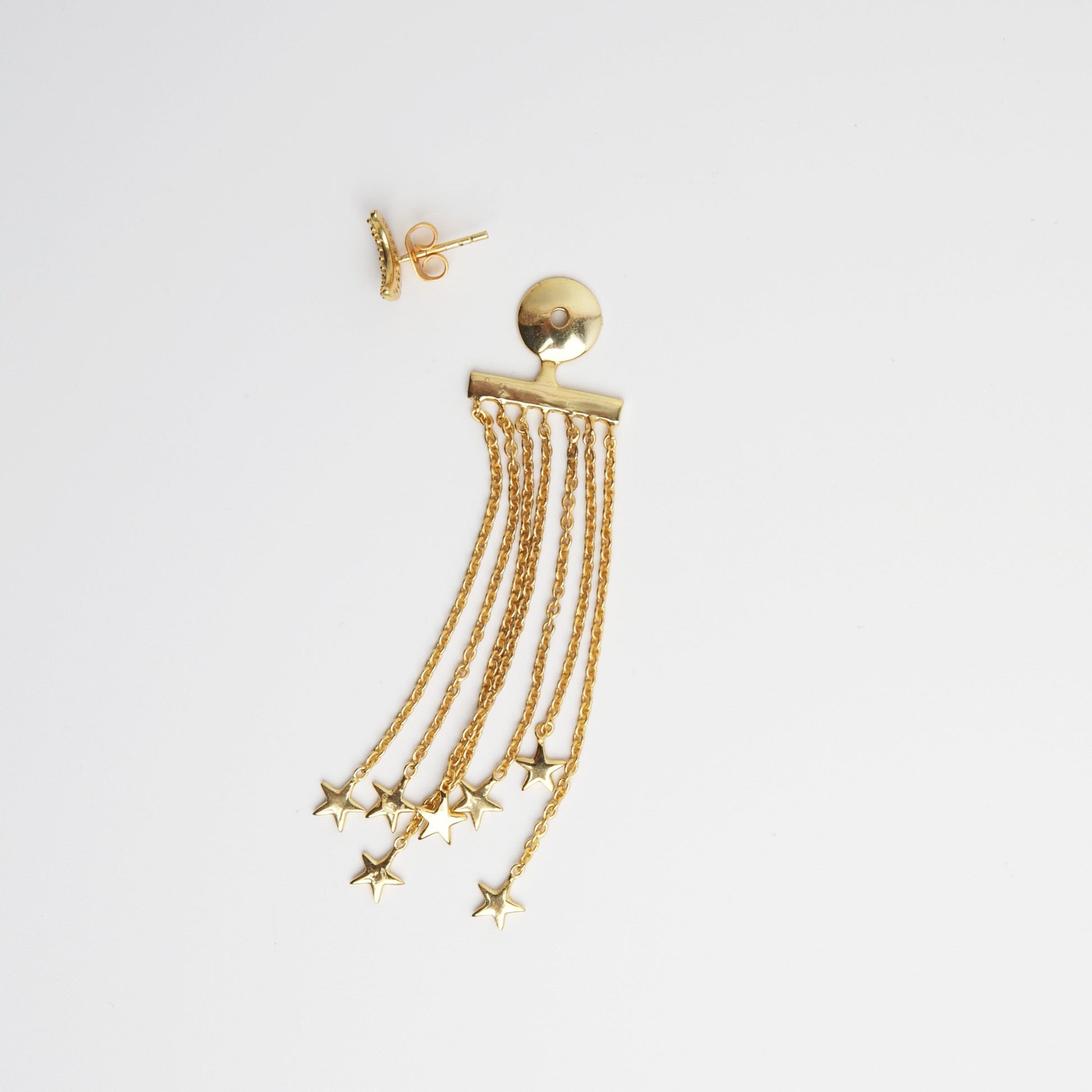 These moon studs with thin lines of wafer thin stars are guaranteed to be a staple piece in your wardrobe. With the ear jacket feature, these earrings can be worn three different ways, essentially giving you 3 earrings in one.