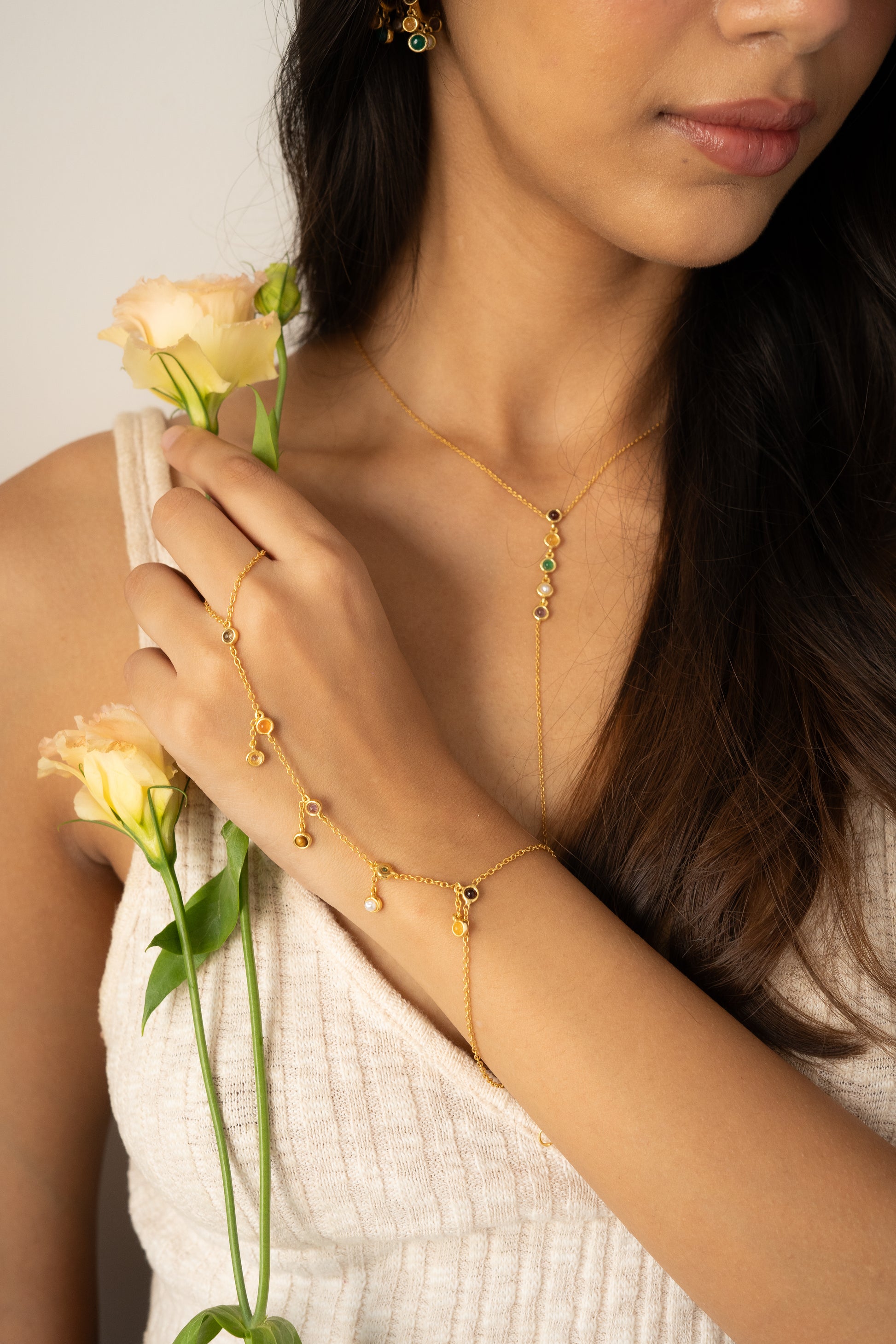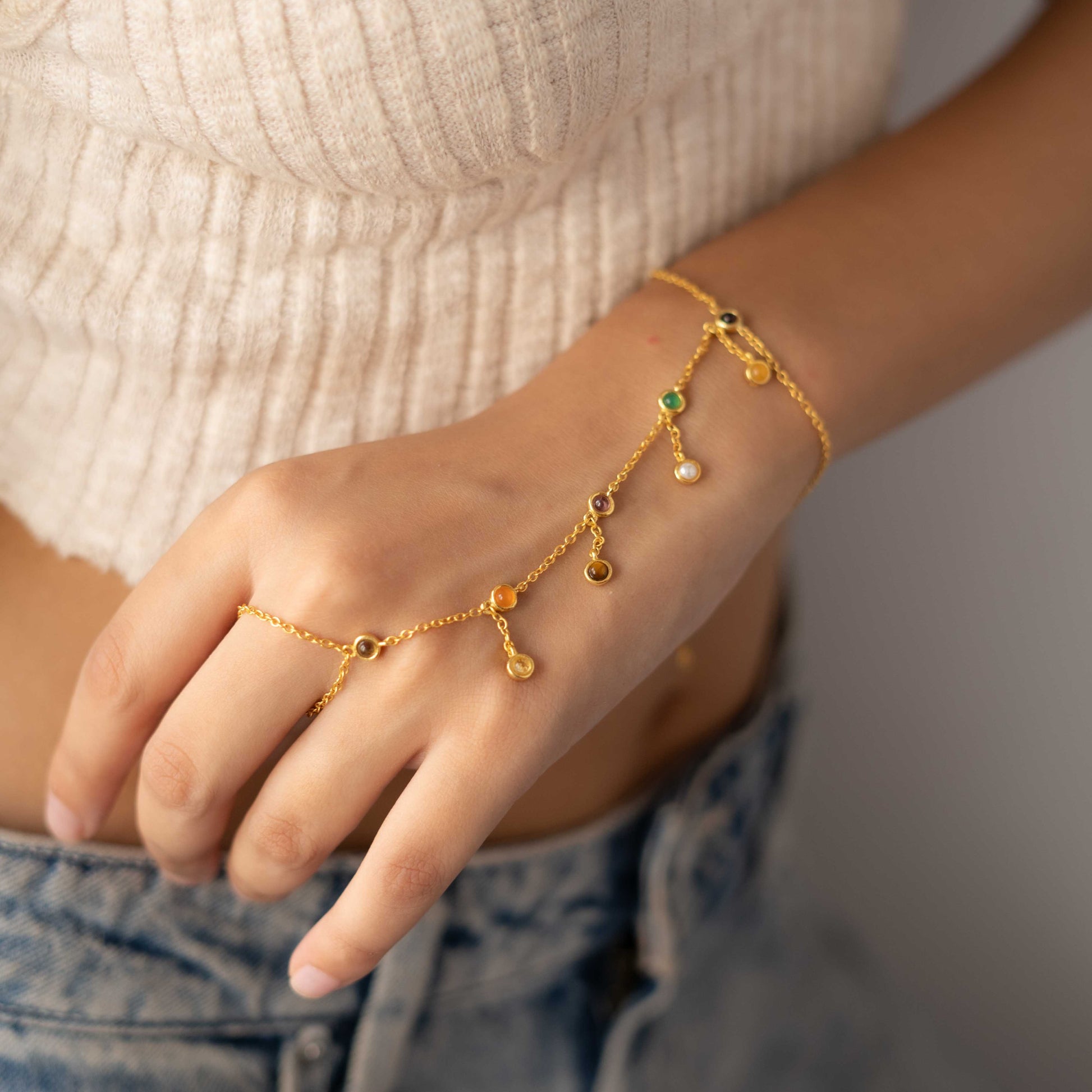 Elevate your style with our exquisite Delicate Chain Handpiece, featuring the timeless allure of Navrattan semi-precious stones. This elegant piece combines tradition and modernity, with nine vibrant gemstones carefully set on a sleek, lightweight chain. Perfect for festive occasions or everyday sophistication, this handpiece adds a pop of color and charm to your look while maintaining a refined, minimalistic aesthetic.