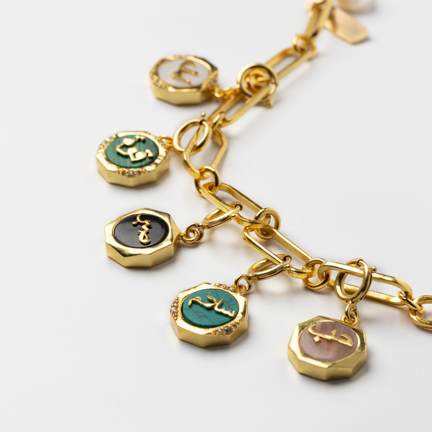 Handcrafted in 18k gold plated brass these Arabic Scripture Charms bracelet is a chance to express who you are and to hold on to precious thoughts. This Charm is all about giving one a positive or optimistic attitude about all the events in one's day to day life. This Bracelet has five Charms with LOVE, HOPE, PEACE, POWER & SABR unscripted on them.